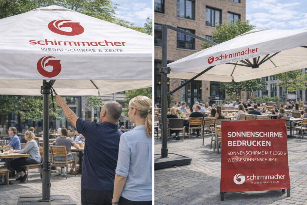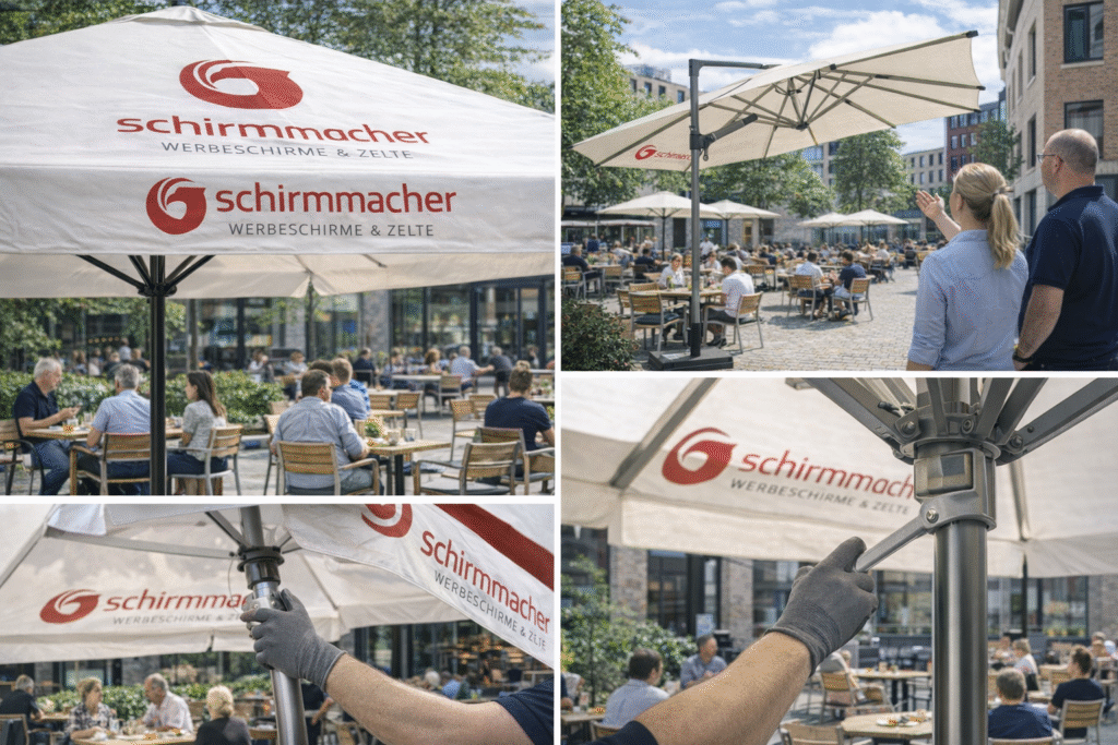 Die Entscheidung hängt deshalb weniger von einem pauschalen „besser“ ab und mehr von der Frage, wie der Außenbereich wirken soll. Wer auf ein klares, urbanes Design setzt, fährt mit unbedruckten Stoffen oft sehr gut. Wer Sichtbarkeit, Wiedererkennung und markante Außenwirkung braucht, kann von einem Druck stark profitieren. Wichtig ist nur, dass Gestaltung nicht gegen Funktion arbeitet. Ein Logo nützt wenig, wenn der Schirm zwar gut aussieht, aber im Alltag unpraktisch ist. Umgekehrt nützt die technisch beste Lösung wenig, wenn sie den Charakter des Betriebs komplett verfehlt.